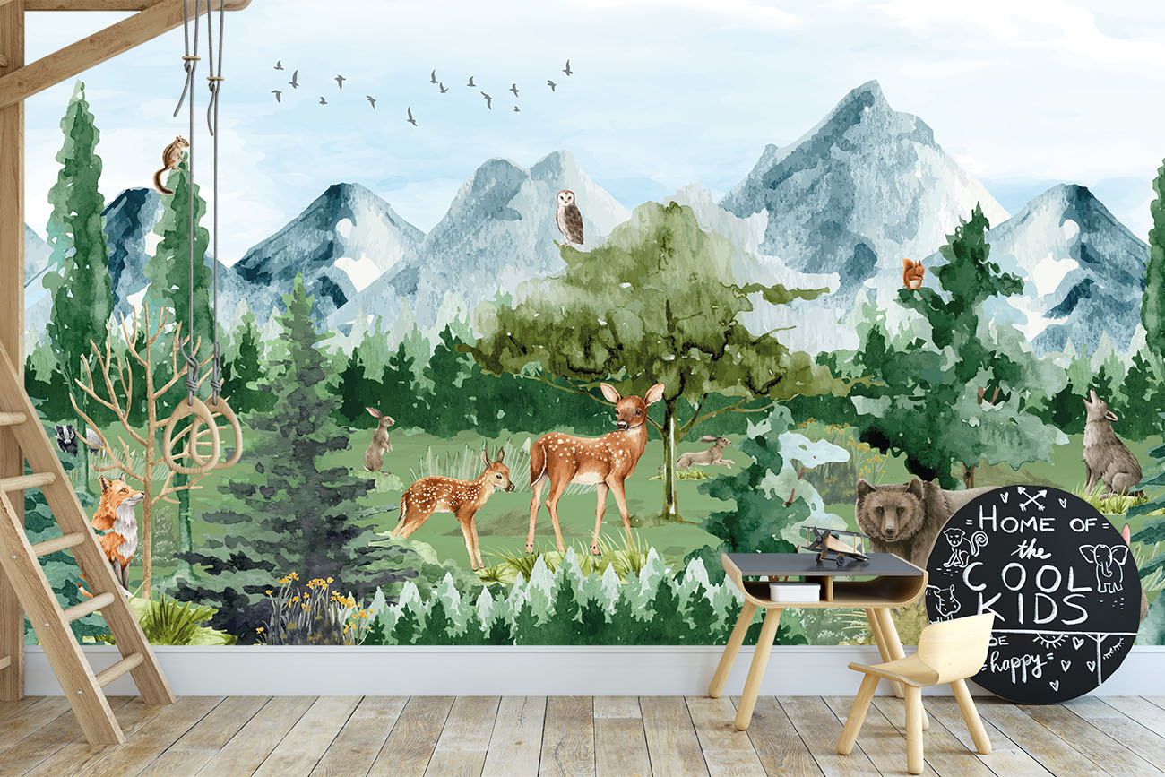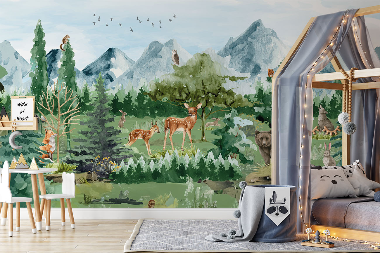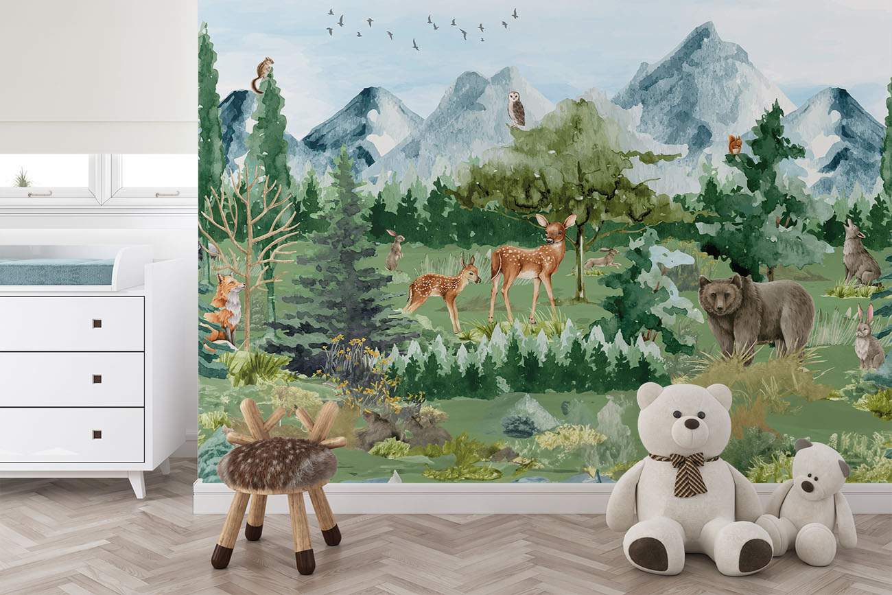 Creëer een serene bosatmosfeer in de kinderkamer met ons op maat gemaakte bos behang, vol zachtaardige dieren en weelderig groen voor een rustgevend gevoel. We kunnen desgewenst alle dieren voor je veranderen.