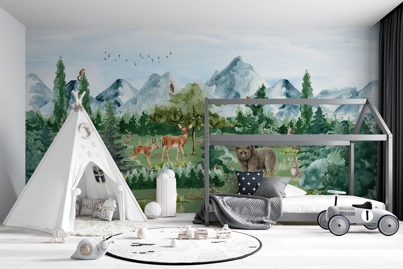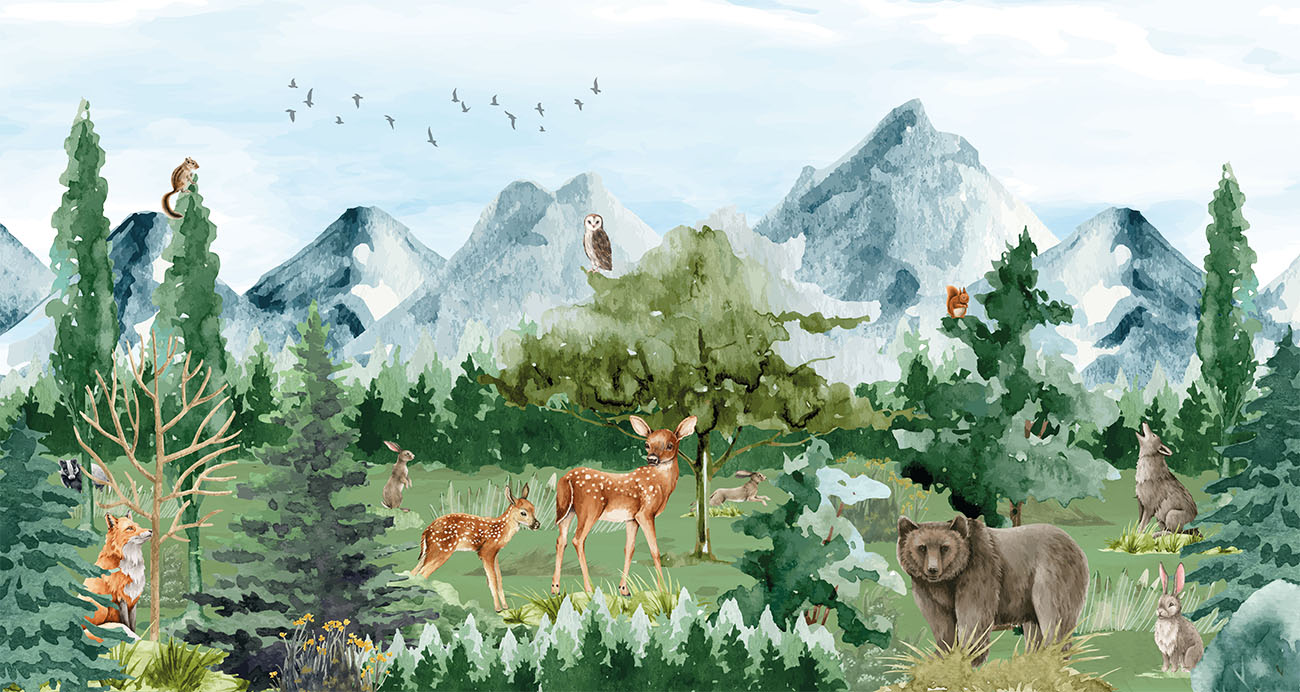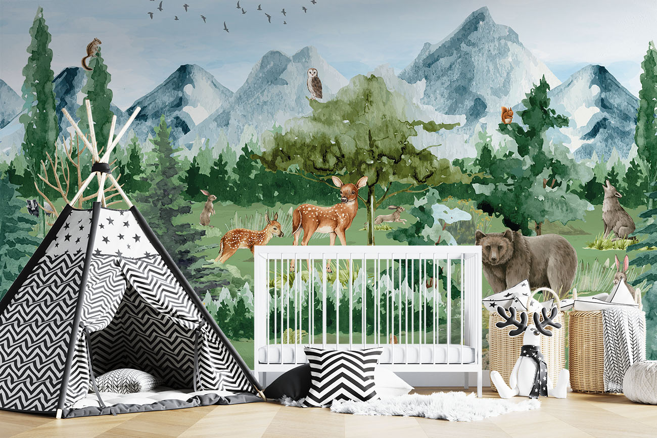 Creëer een serene bosatmosfeer in de kinderkamer met ons op maat gemaakte bos behang, vol zachtaardige dieren en weelderig groen voor een rustgevend gevoel. We kunnen desgewenst alle dieren voor je veranderen.