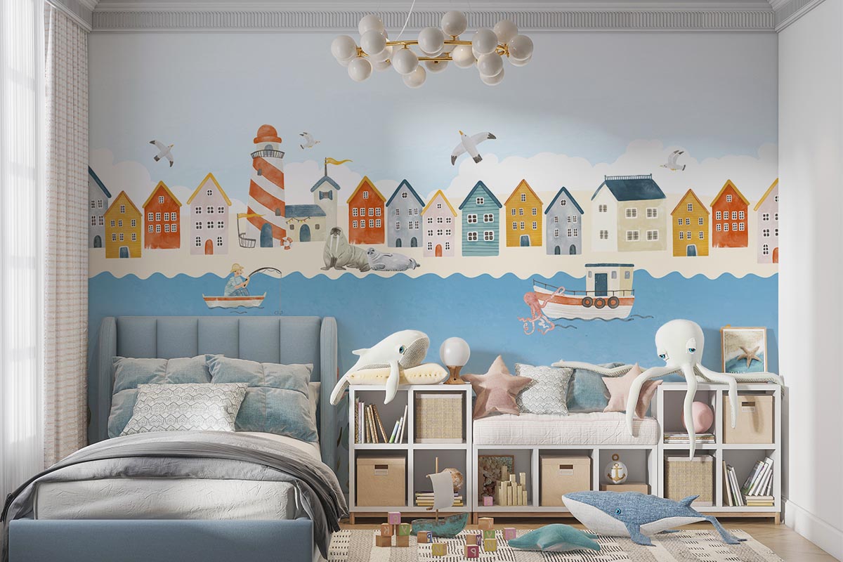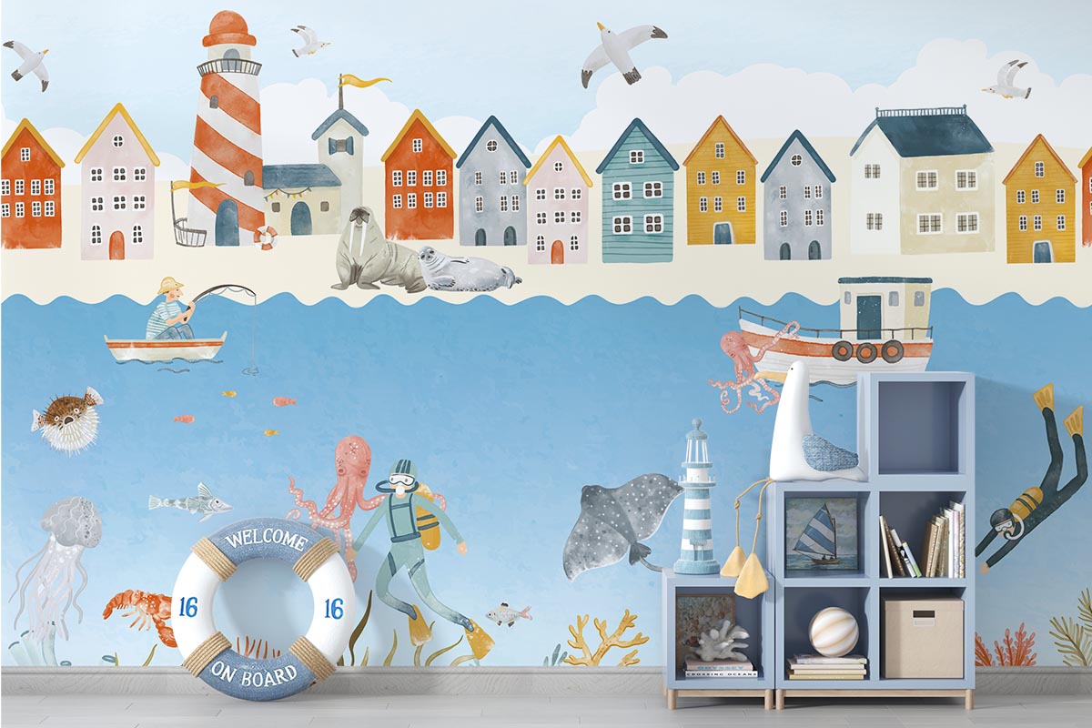 Vrolijk onderwater behang waar je een kijkje onder- én bovenwater kunt nemen.
