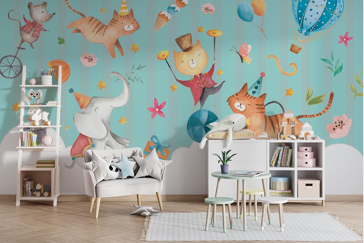 In jouw kinderkamer is het voortaan altijd feest met dit toffe circus behang.