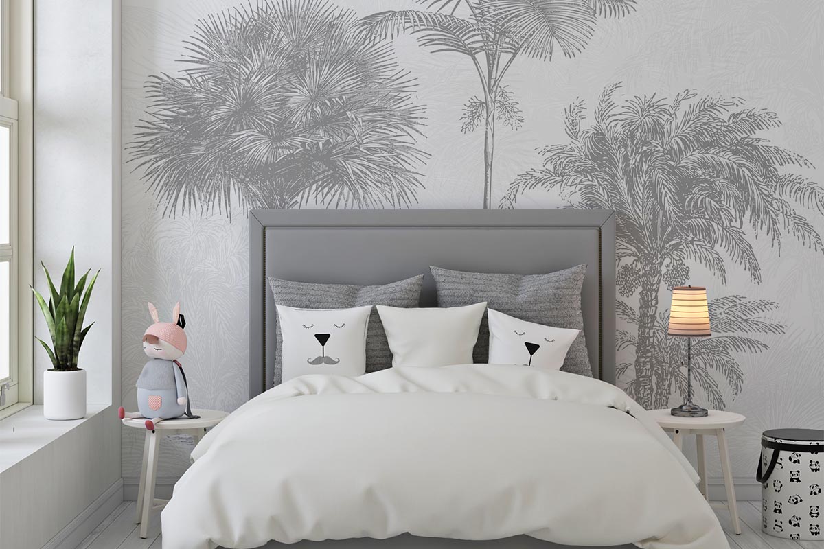 Chique en rustig behang met vintage afbeeldingen van palmbomen en bamboe.