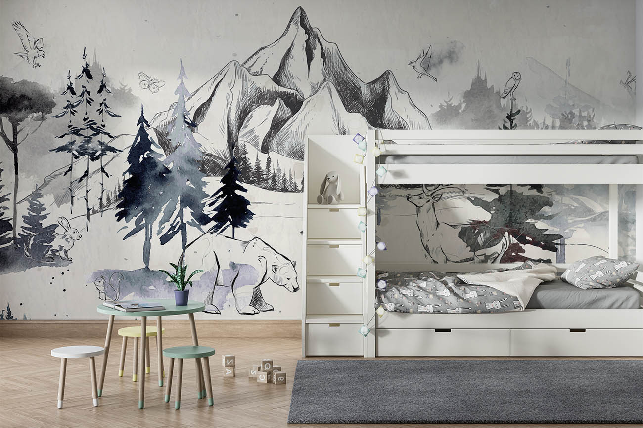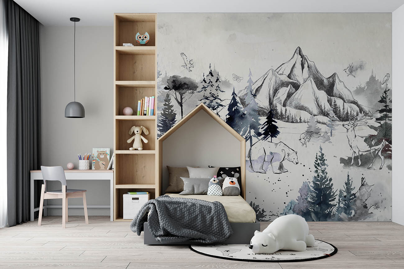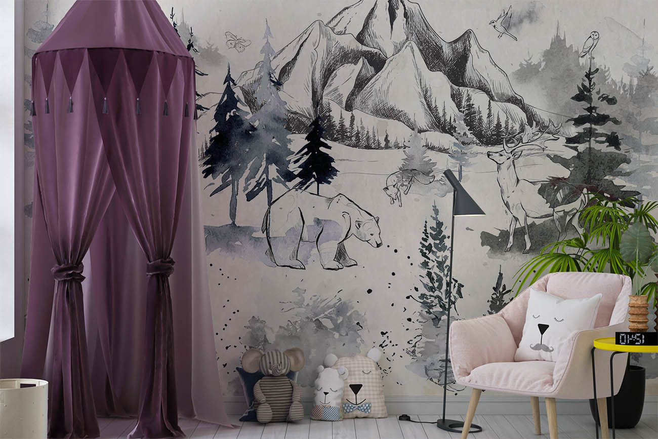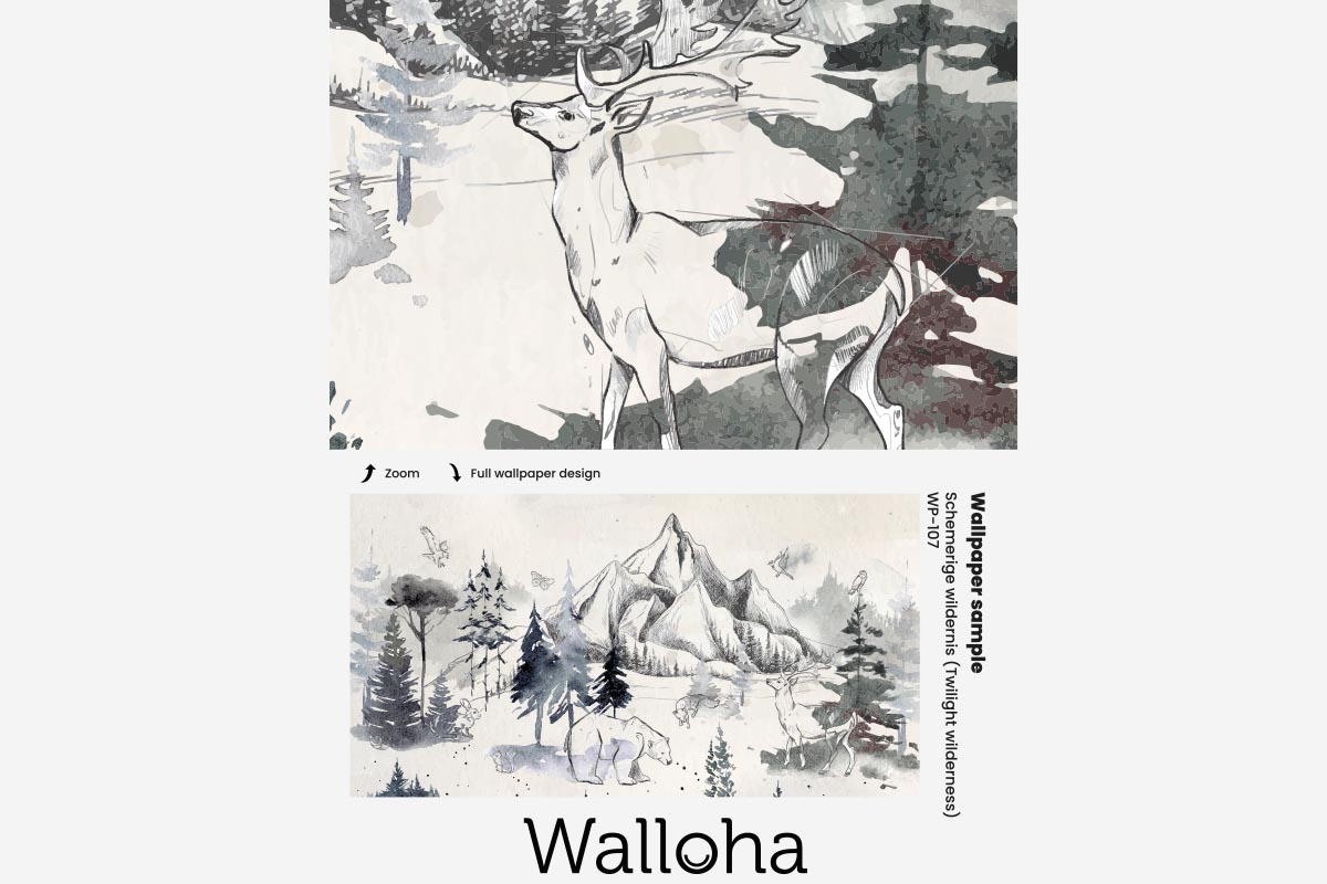 Transformeer de kinderkamer naar een bosrijk wonderland met ons Schemerige Wildernis behang, aanpasbaar in ieder formaat voor een persoonlijke, rustgevende sfeer.