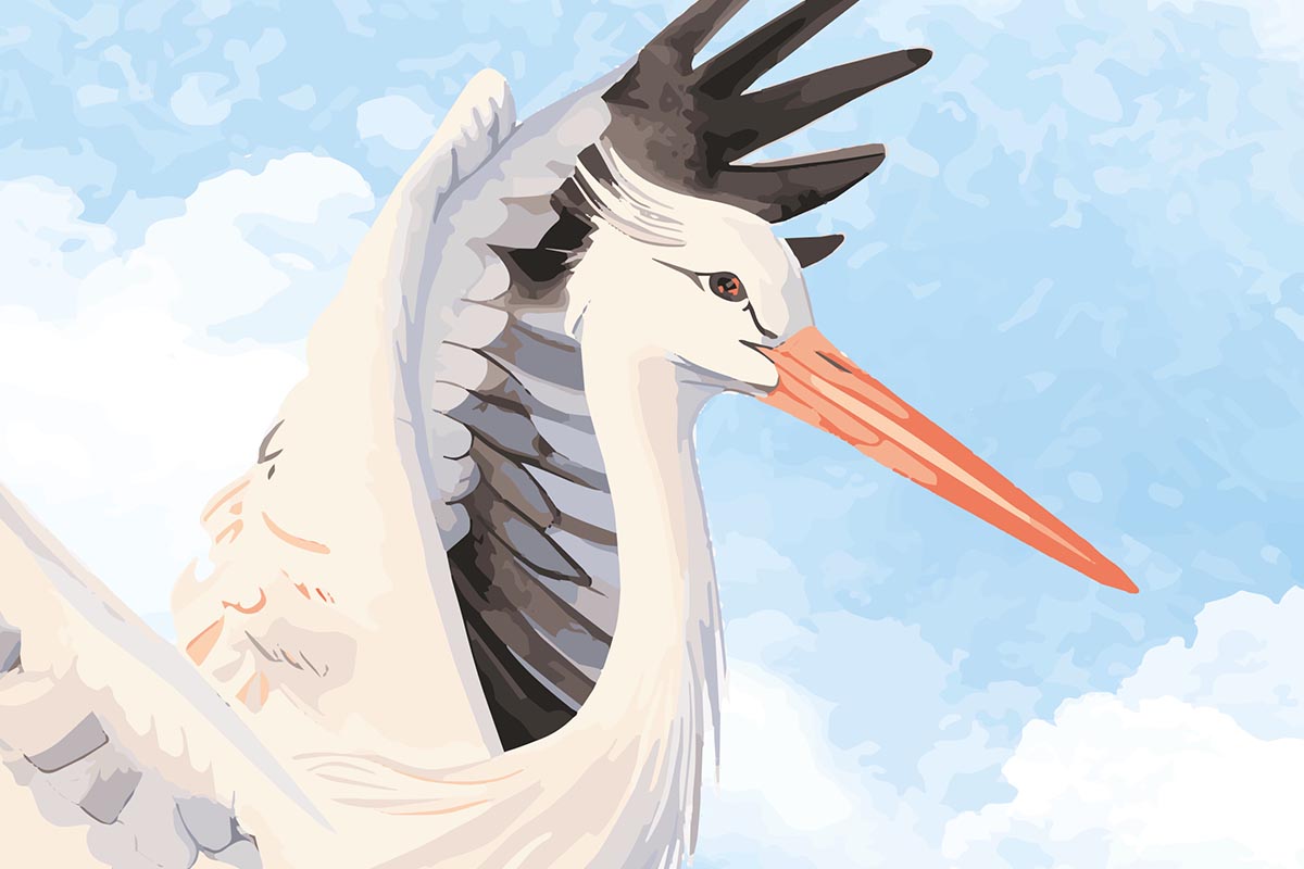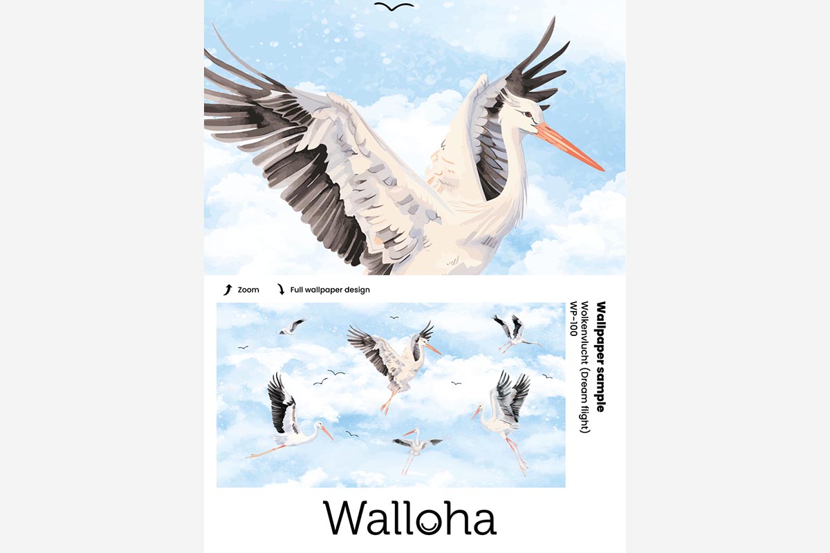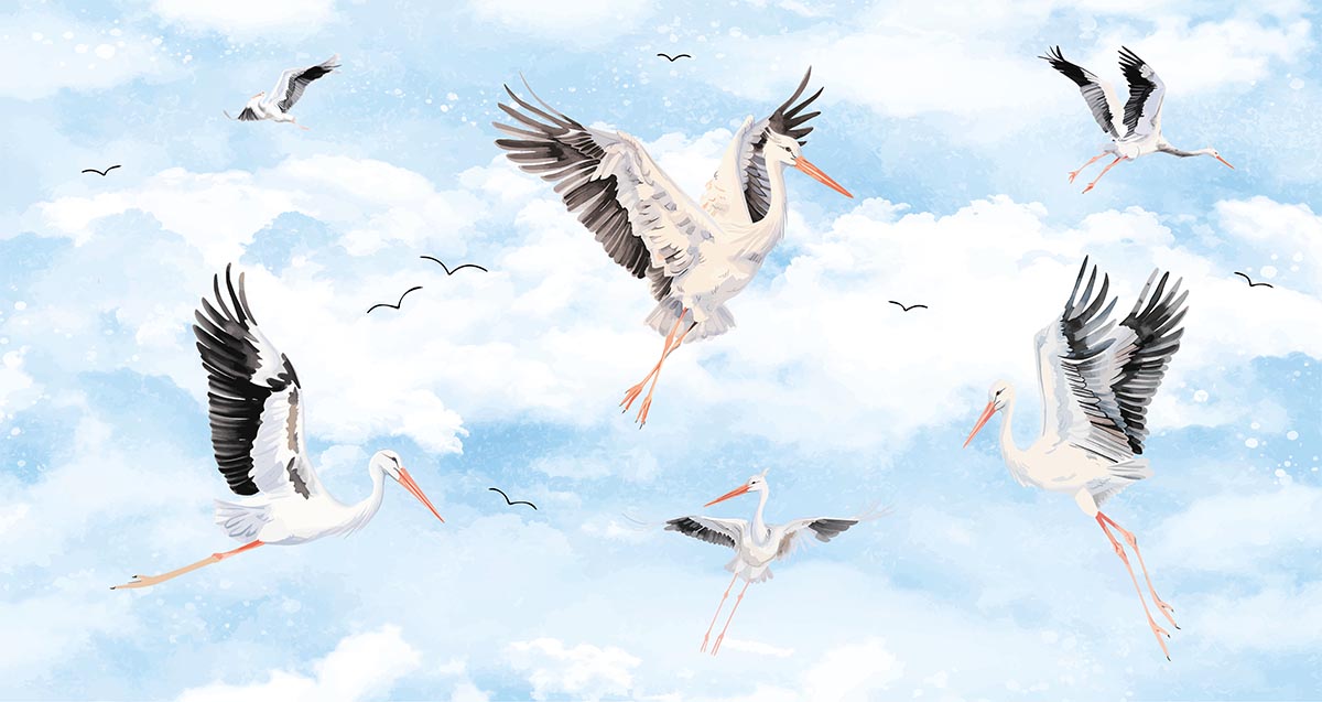 Dromerig wolkenbehang met ooievaars in de lucht.