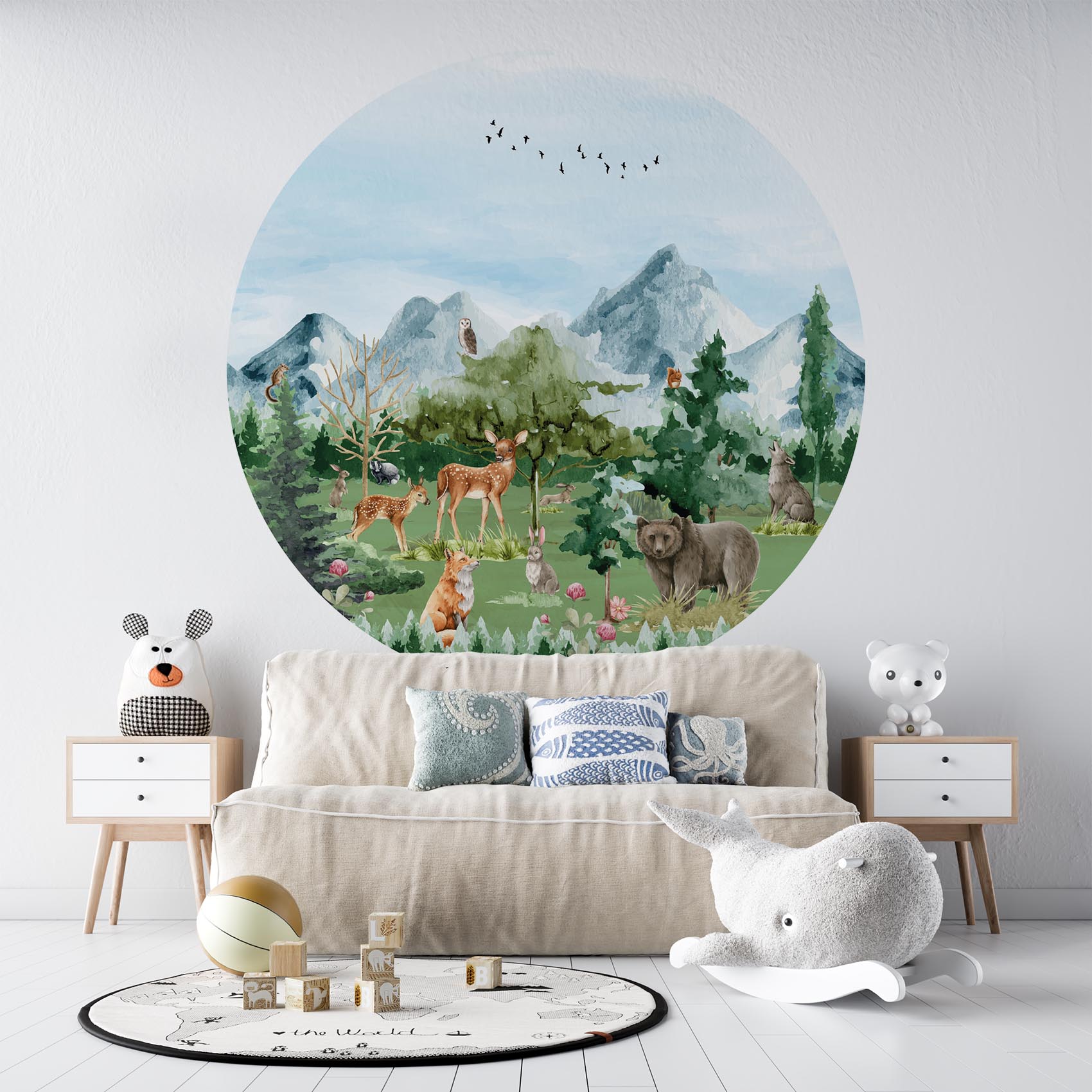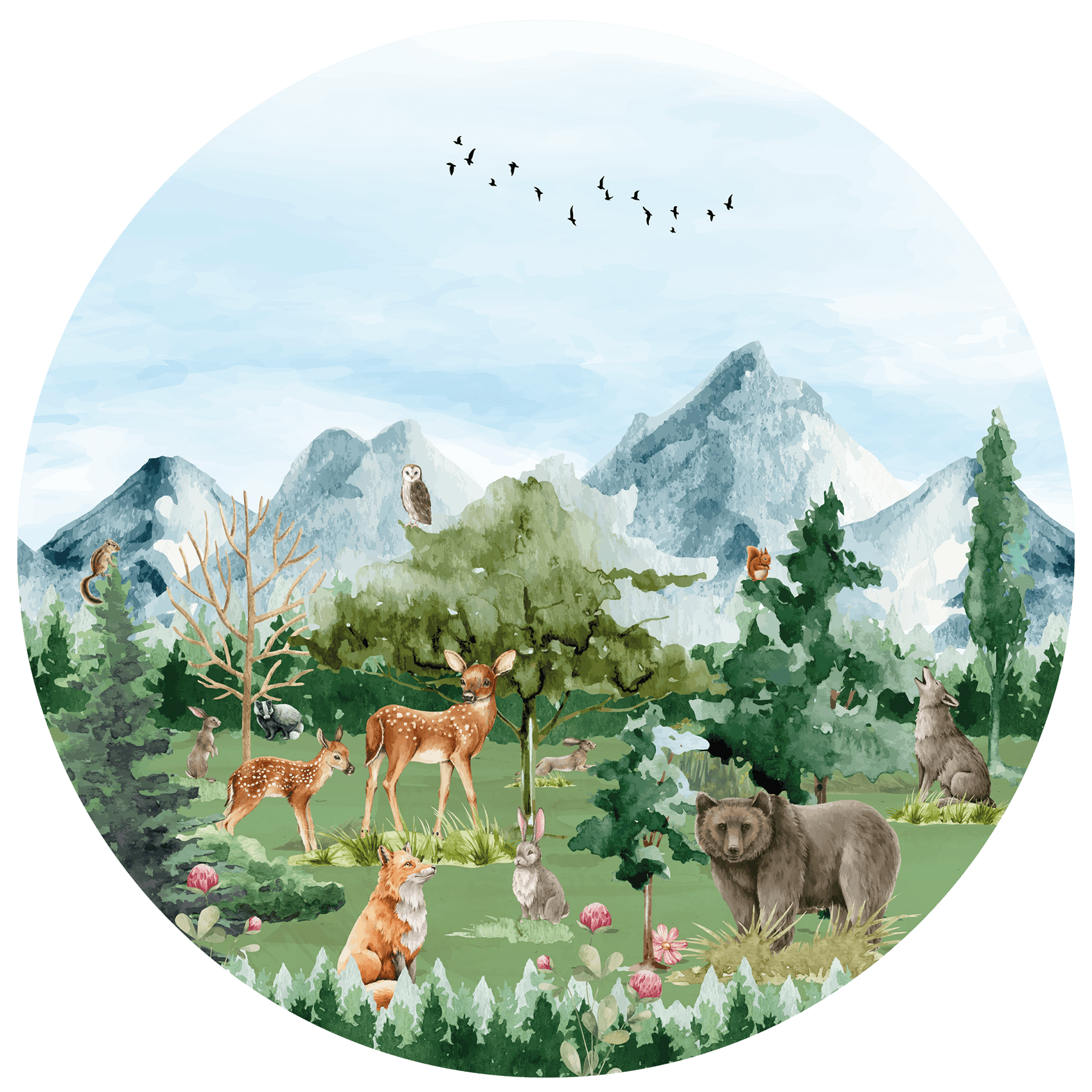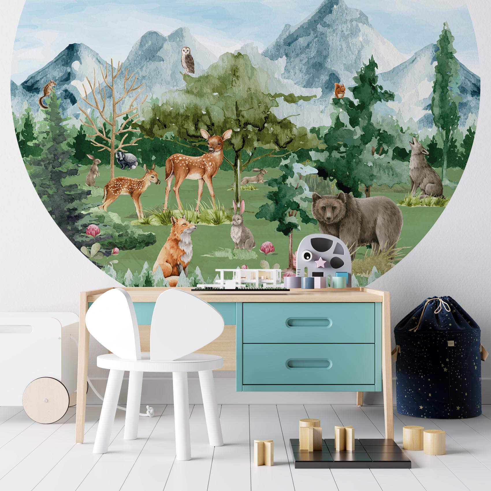 Ga op ontdekking in het bos met deze prachtige behangcirkel! De Herten, beer, vos en uilen brengen de kinderkamer tot leven en zorgen voor een rustige, avontuurlijke sfeer. Geef de kinderkamer een instant sfeerboost met deze behangcirkel!