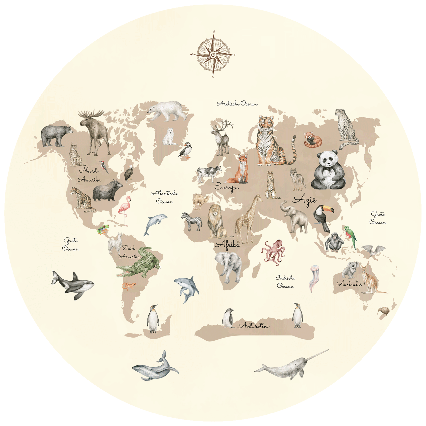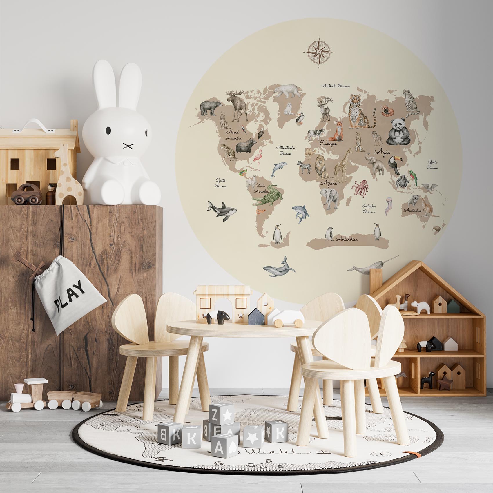 Deze speelse wereldkaart laat kinderen kennismaken met dieren van over de hele wereld. Een leerzame en stijlvolle blikvanger voor elke avontuurlijke kinderkamer. Geef de kinderkamer een instant sfeerboost met deze behangcirkel!