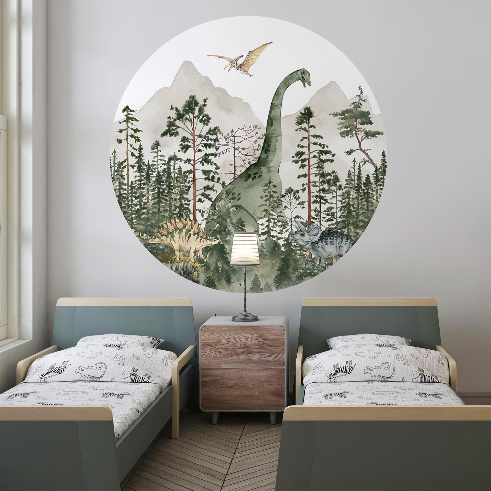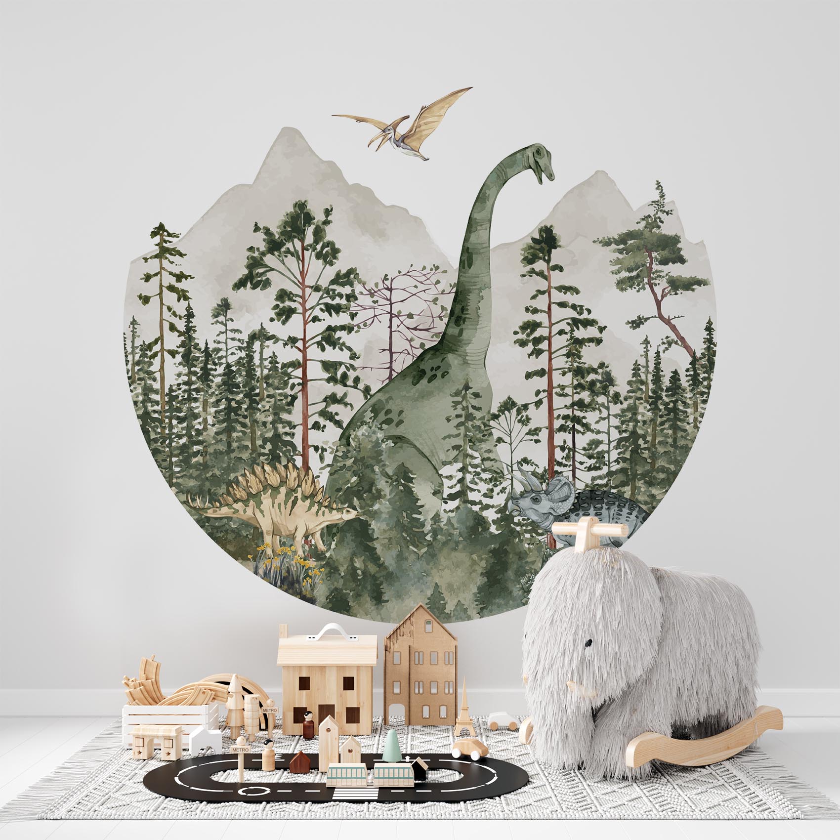 Breng de oertijd tot leven met deze stoere behangcirkel! De brachiosaurus, triceratops en vliegende reptielen zorgen voor een avontuurlijke en fantasierijke sfeer. Geef de kinderkamer een instant sfeerboost met deze behangcirkel!