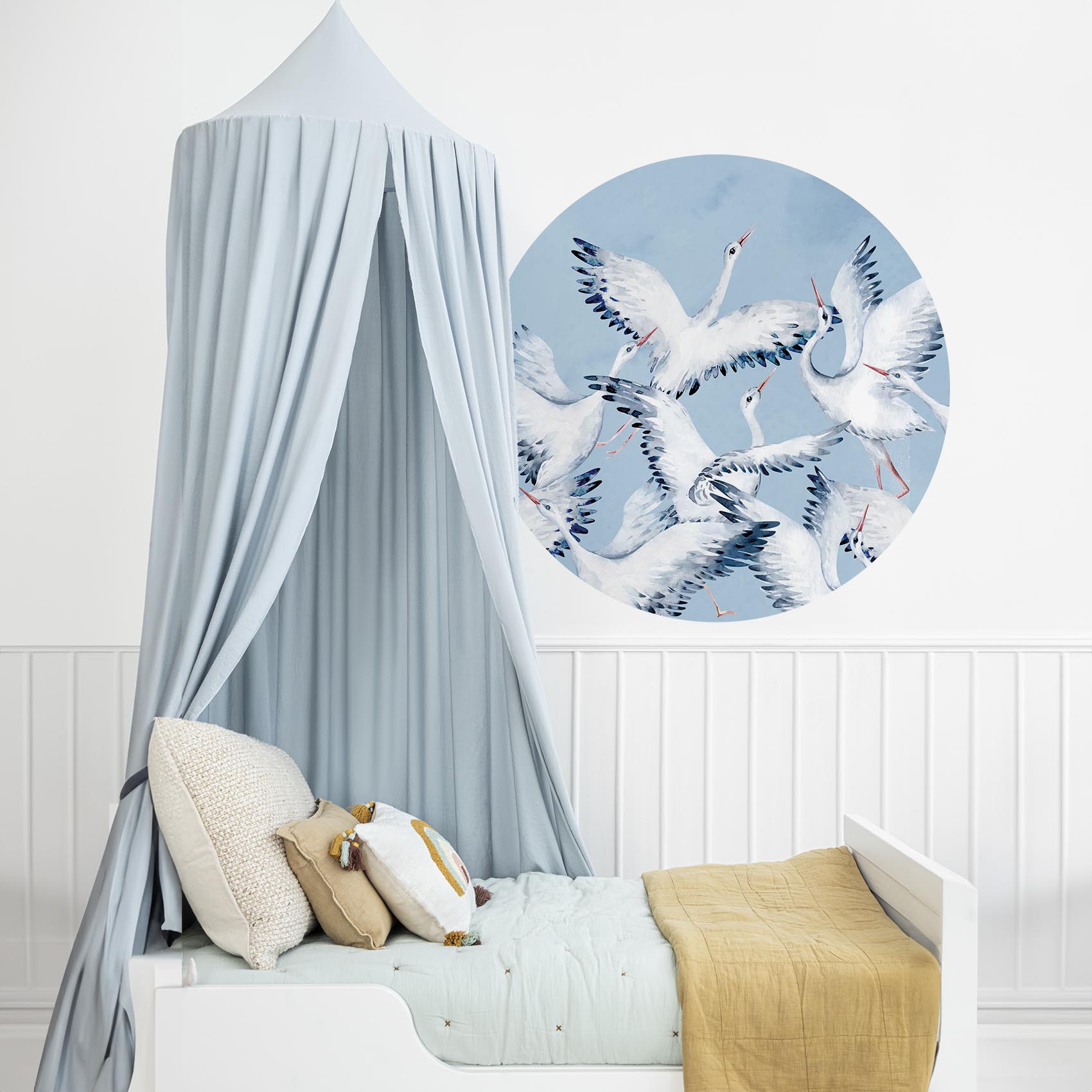 Ooievaars zweven sierlijk door de lucht en brengen een rustig, speels gevoel in de babykamer. De zachte blauwtinten maken dit ontwerp perfect voor een dromerige en frisse uitstraling. Geef de kinderkamer een instant sfeerboost met deze behangcirkel!