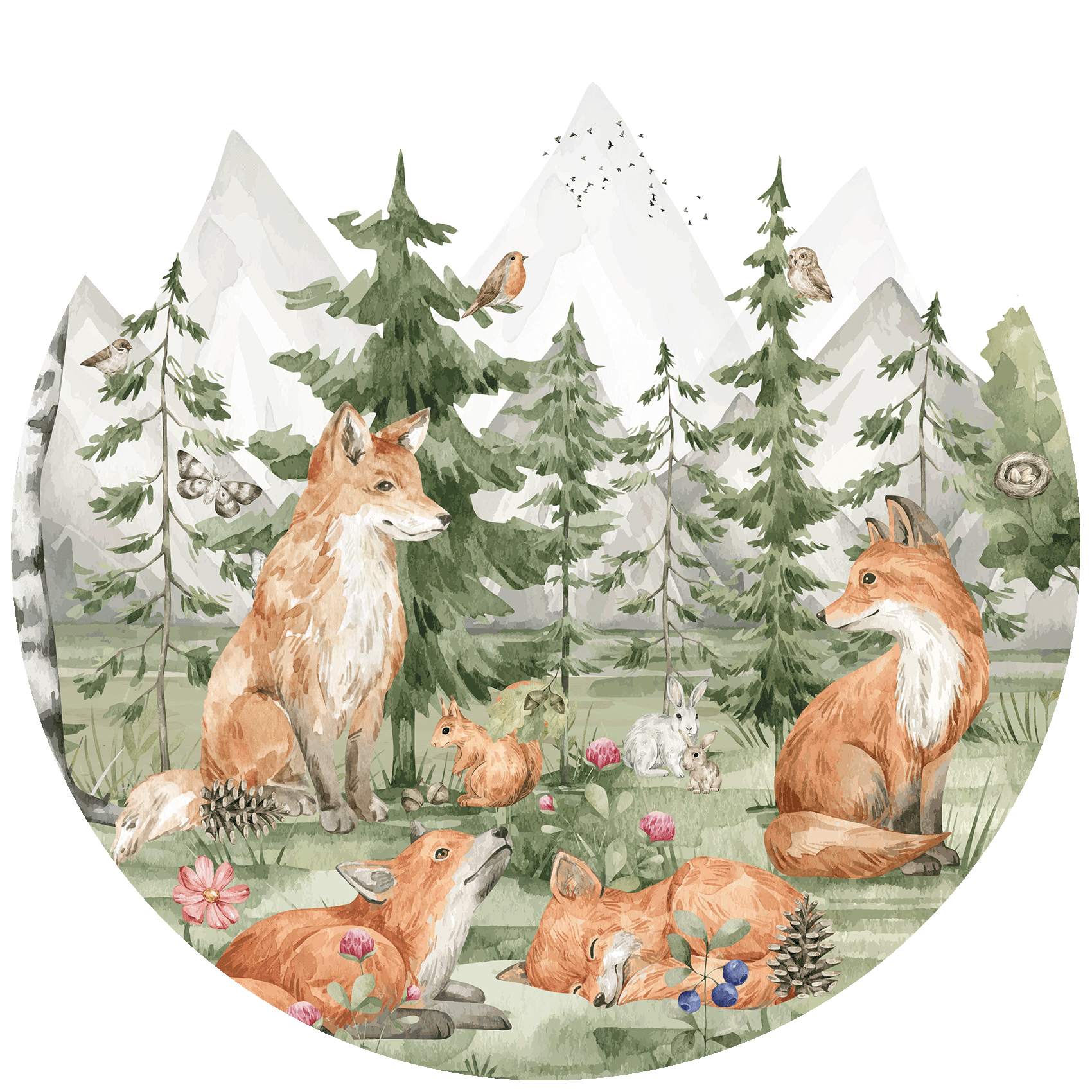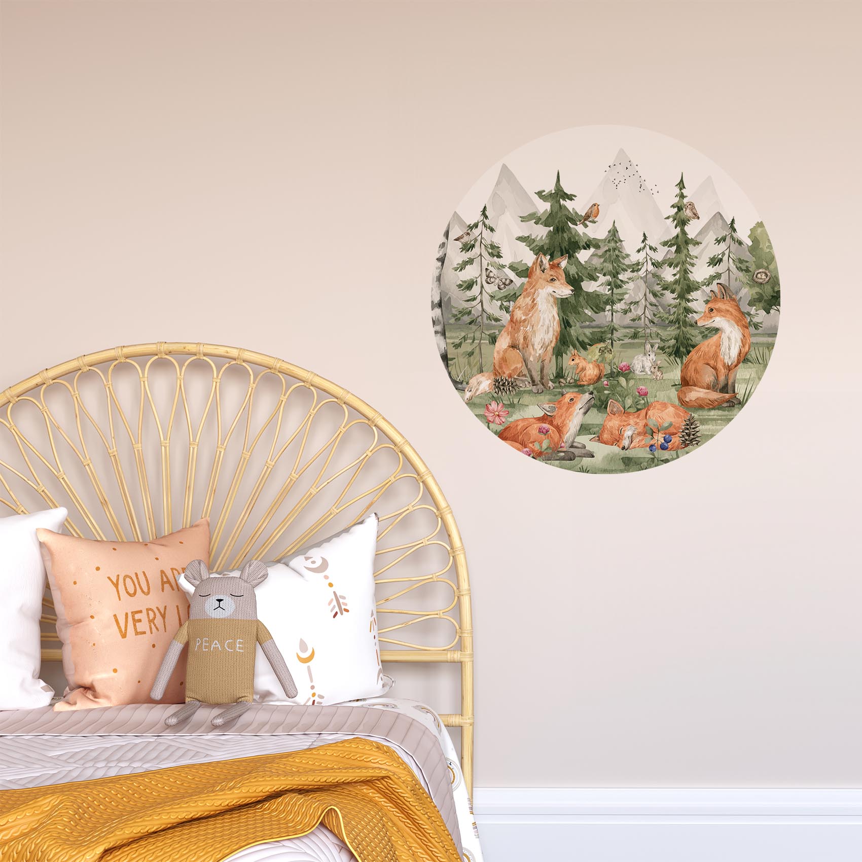 Speelse vosjes tussen de bomen maken van deze behangcirkel een echte blikvanger. De warme tinten en natuurlijke details zorgen voor een gezellige en rustgevende sfeer. Geef de kinderkamer een instant sfeerboost met deze behangcirkel!