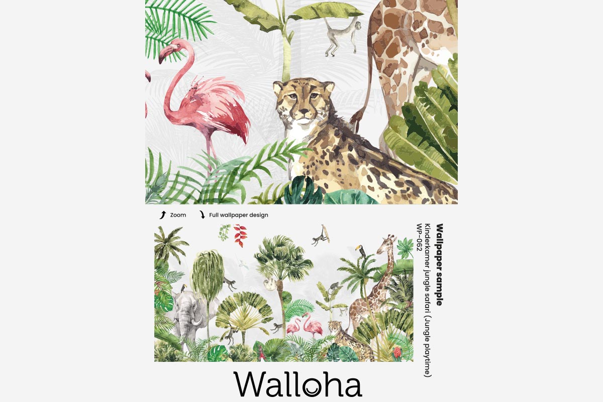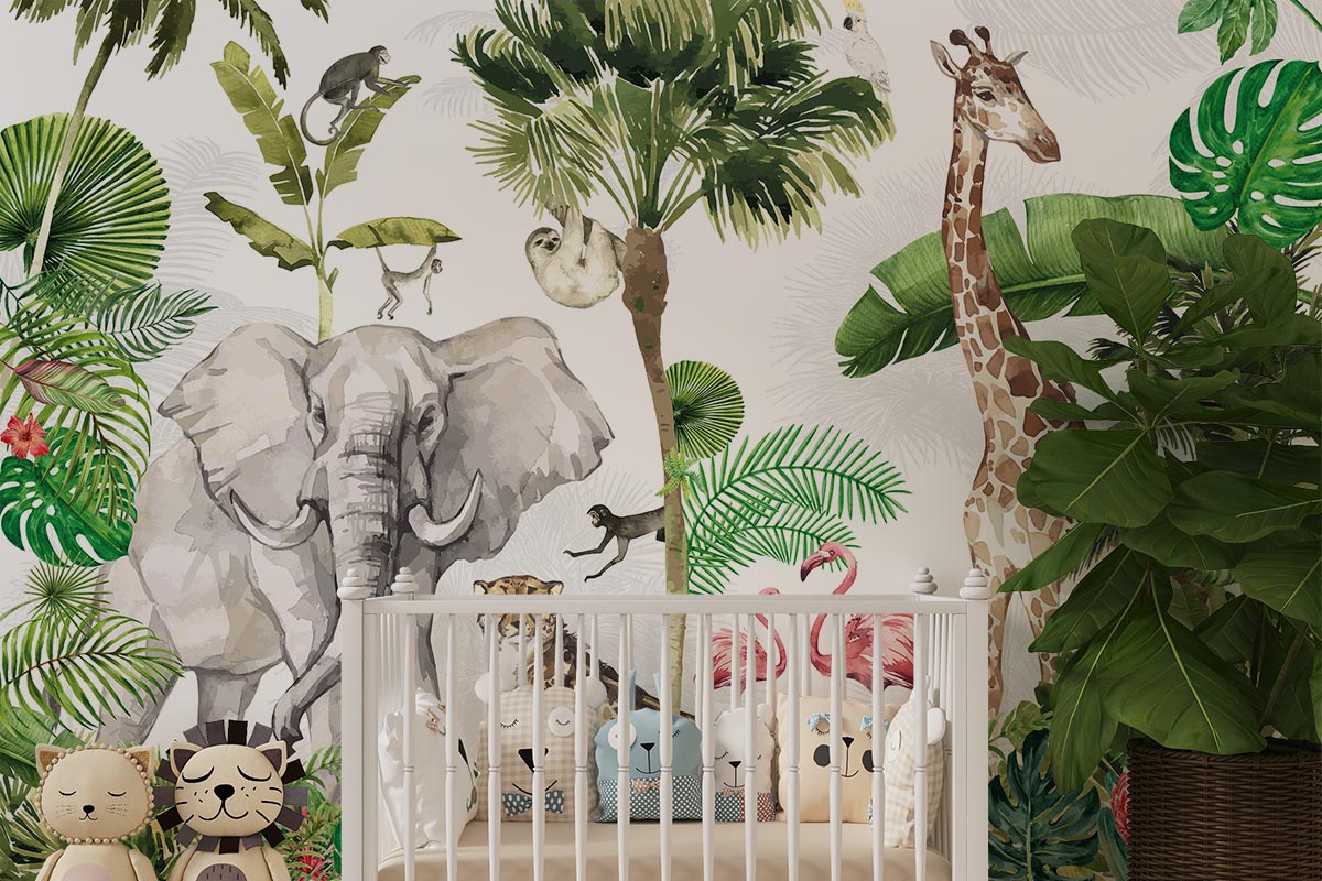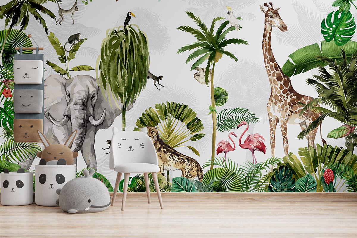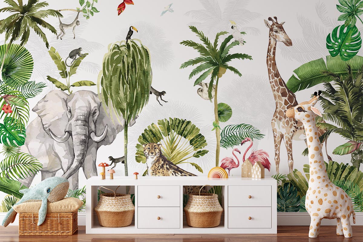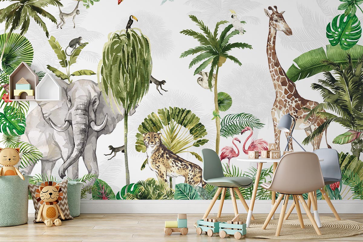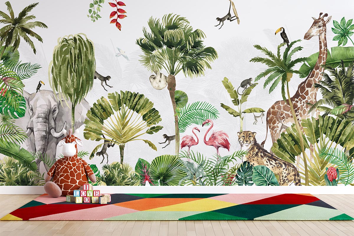 Tropical jungle wallpaper featuring a colorful collection of wild animals.