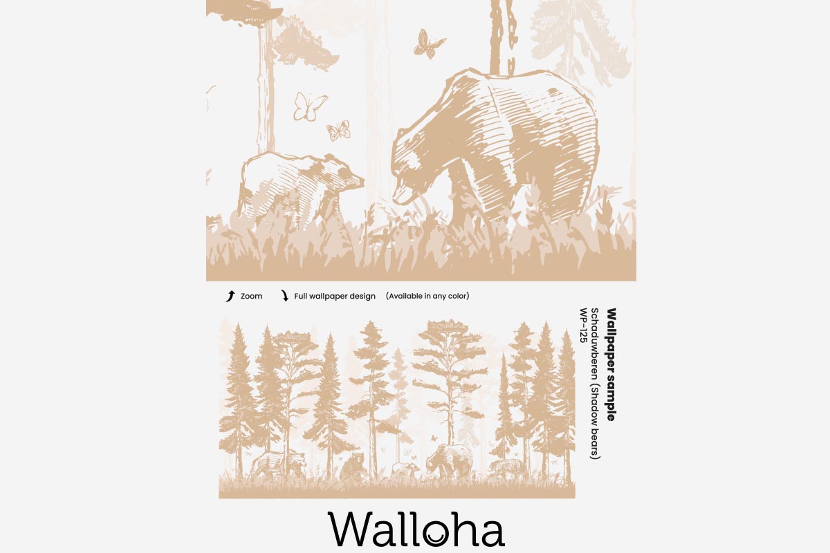 Hand-drawn sepia bear wallpaper for a woodland-themed nursery. Customizable with colors and animals of your choice.