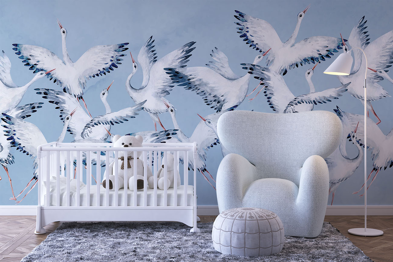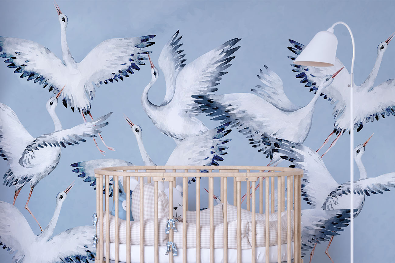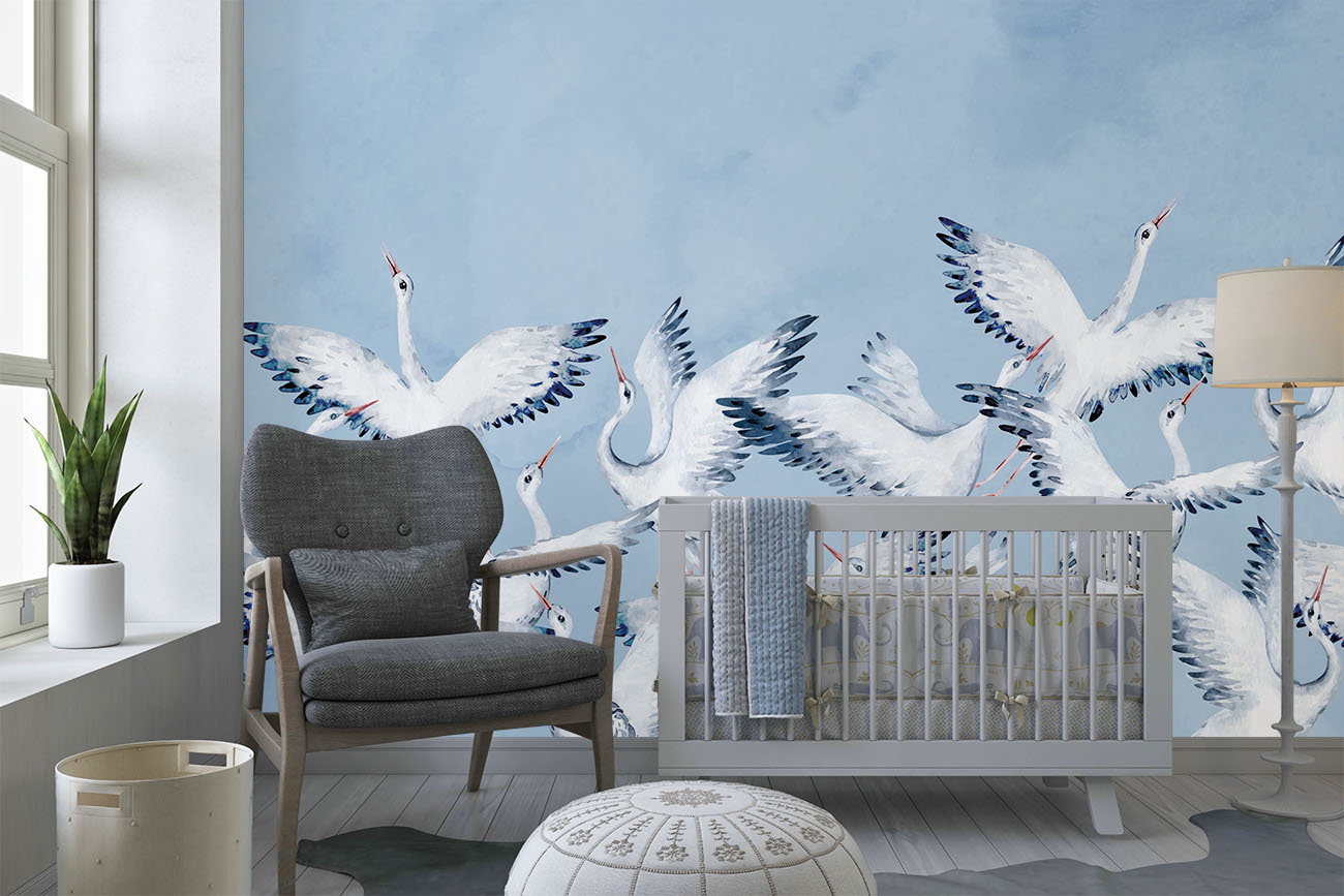 Calming crane wallpaper with flying storks. With a customizable background color.