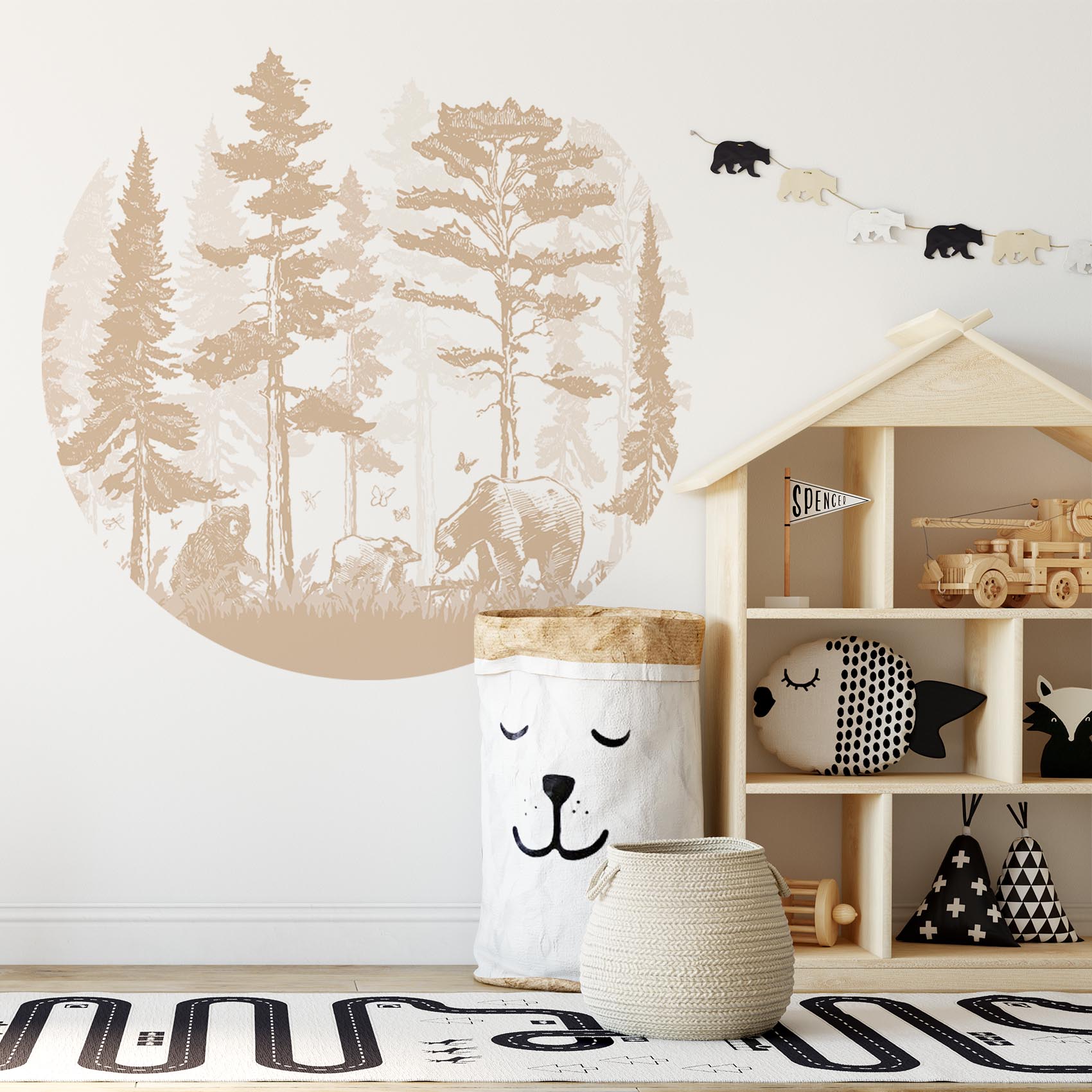 Step into a peaceful forest where bears roam among towering trees in soft sepia tones. This vintage-style wallpaper circle creates a warm, nostalgic atmosphere, perfect for a nursery, toddler room, or cozy reading nook. Give the space an instant style boost with this wallpaper circle!