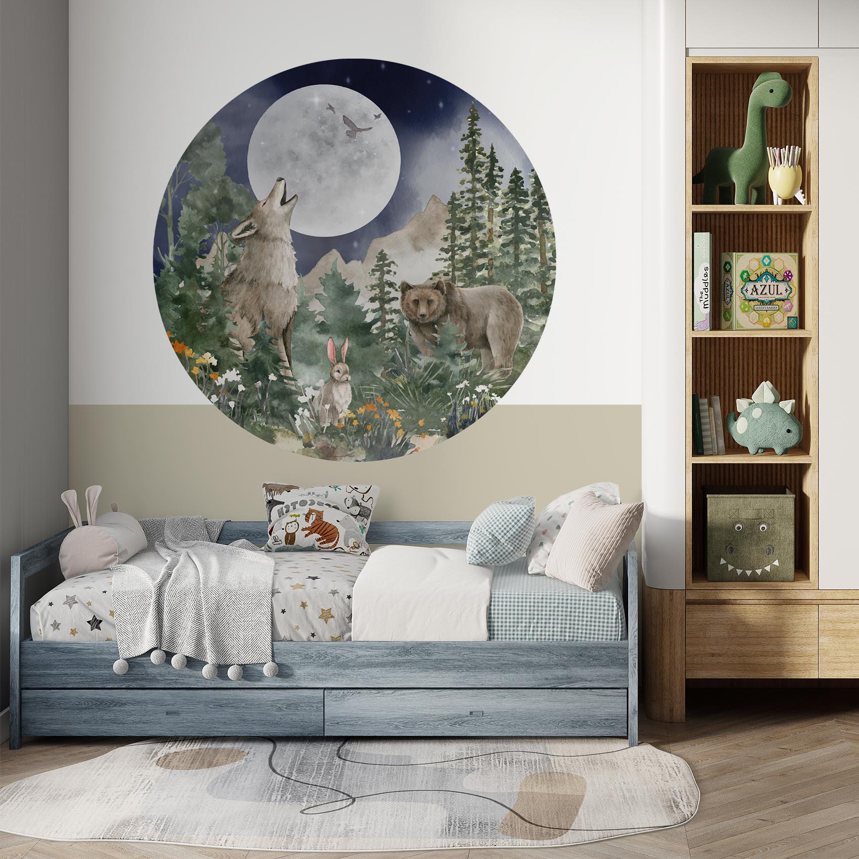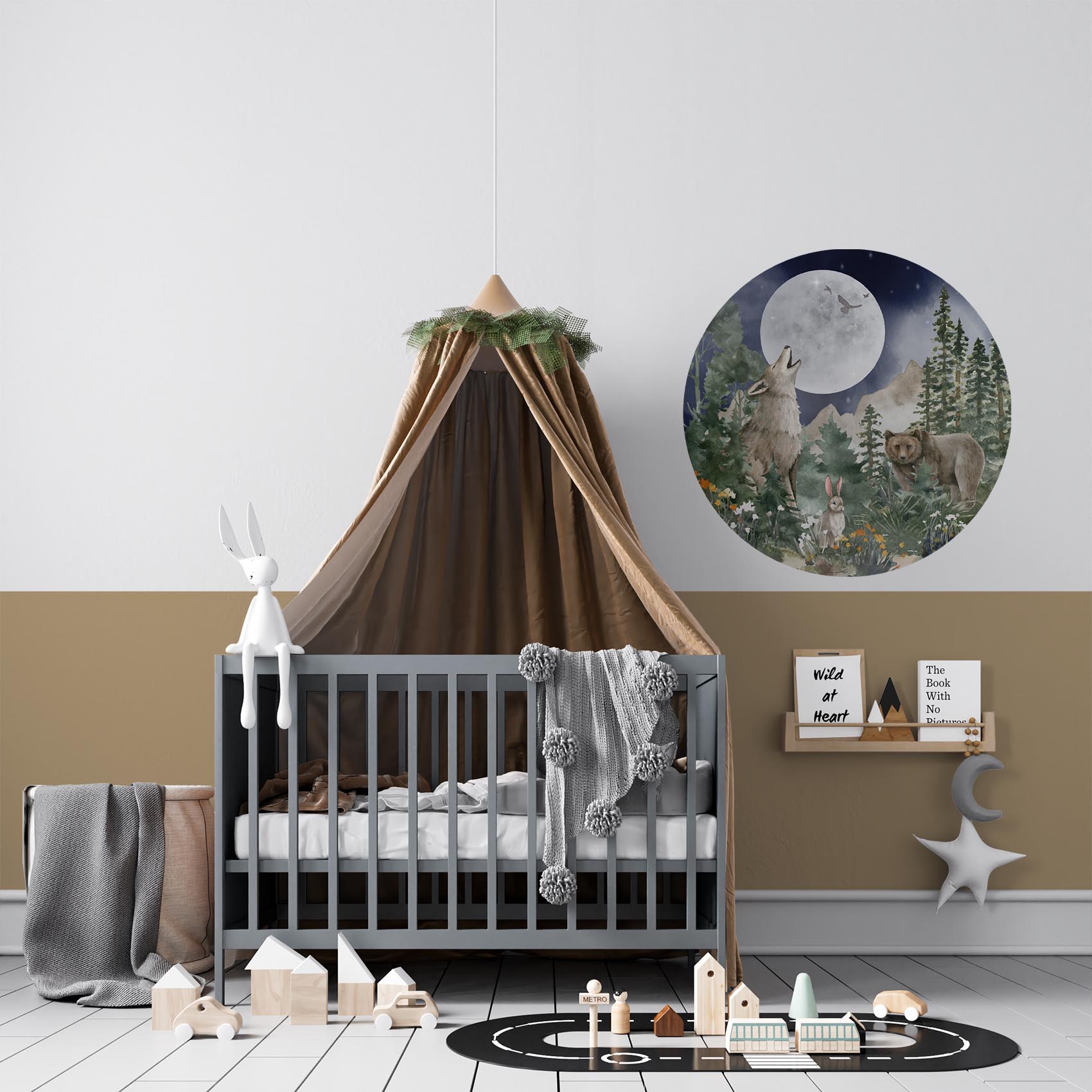 A howling wolf, a glowing full moon, and deep pine forests—this design brings the mystery of the wild right into the room. Perfect for little adventurers who dream of starry nights and untamed nature. Give the nursery an instant style boost with this wallpaper circle!